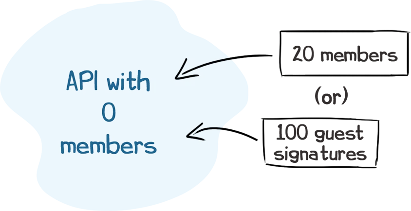 Even if an application (API) has no members, a minimum subscription of one unit shall be debited on every due date. This one unit will automatically cover up to 20 members or 100 guest signatures.